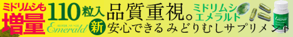 テレビやメディアで話題のみどりむしを使った新サプリメント「ミドリムシエメラルド」を販売しています。この度、2015年モンドセレクションメダル受賞!必要な栄養素の全てが補えることを完全栄養素と言われていますが、みどりむしは足りない栄養素がないと言われる程、完全栄養素にもっとも近い生物で、みどりむしだけを食べていても、栄養面だけのことを言えば、人間は生きていけるとまで言われています。そしてNASAが開発して東京大学が多量培養に成功したみどりむしを粉末にして飲みやすいようにしたサプリメントです。是非お試しください。