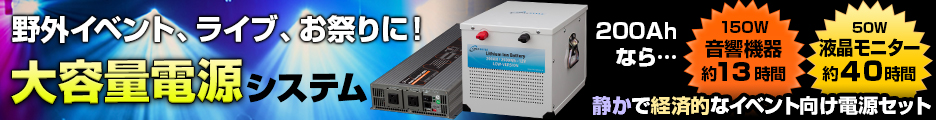 うるさい発電機はもう不要です。リチウムイオンバッテリーと正弦波インバーターを組み合わせ使う分の電気を予め蓄電して使うまったく新しい電源システムを販売しています。今までのエンジン式発電機のようにエンジンをかけて電気をつくる発電システムではないので騒音・排気ガス・振動は一切なく屋内でのイベントやでも使用が可能です。